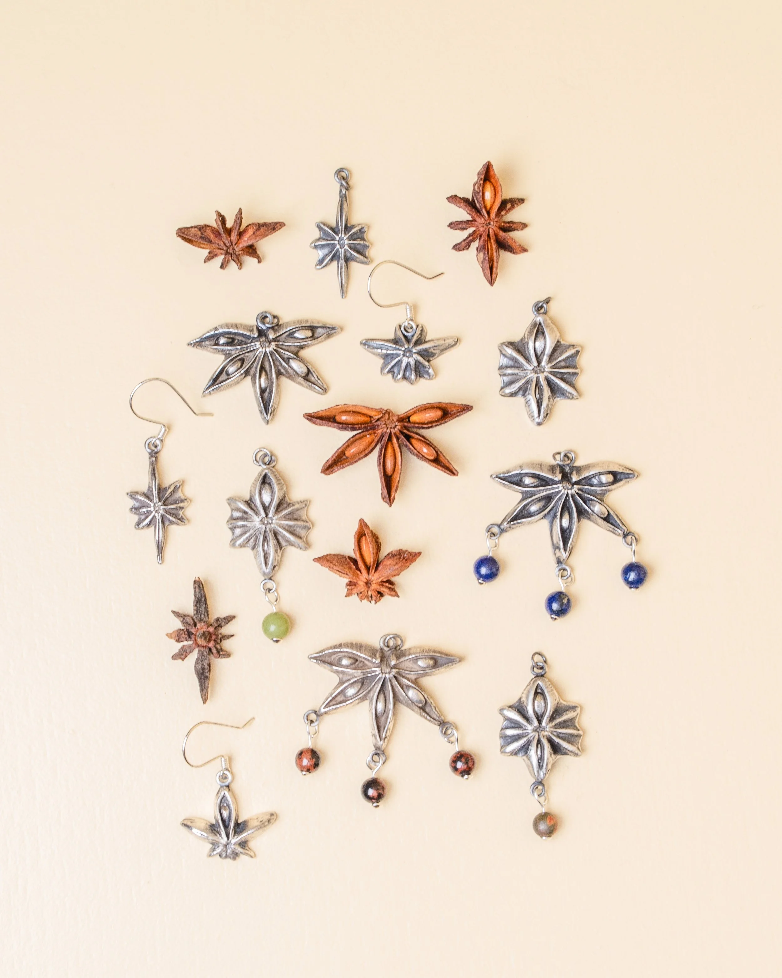 Angel 4+ is extended with a beautiful green Serpentine or Picasso Jaspis stone bead. Fascinated by the idea of historical angels, this collection came to fruition. What do angels, ‘spiritual living beings’, look like? This question was going through my mind. Combining nature and fantasy is how I created 5 angels from star anise.
