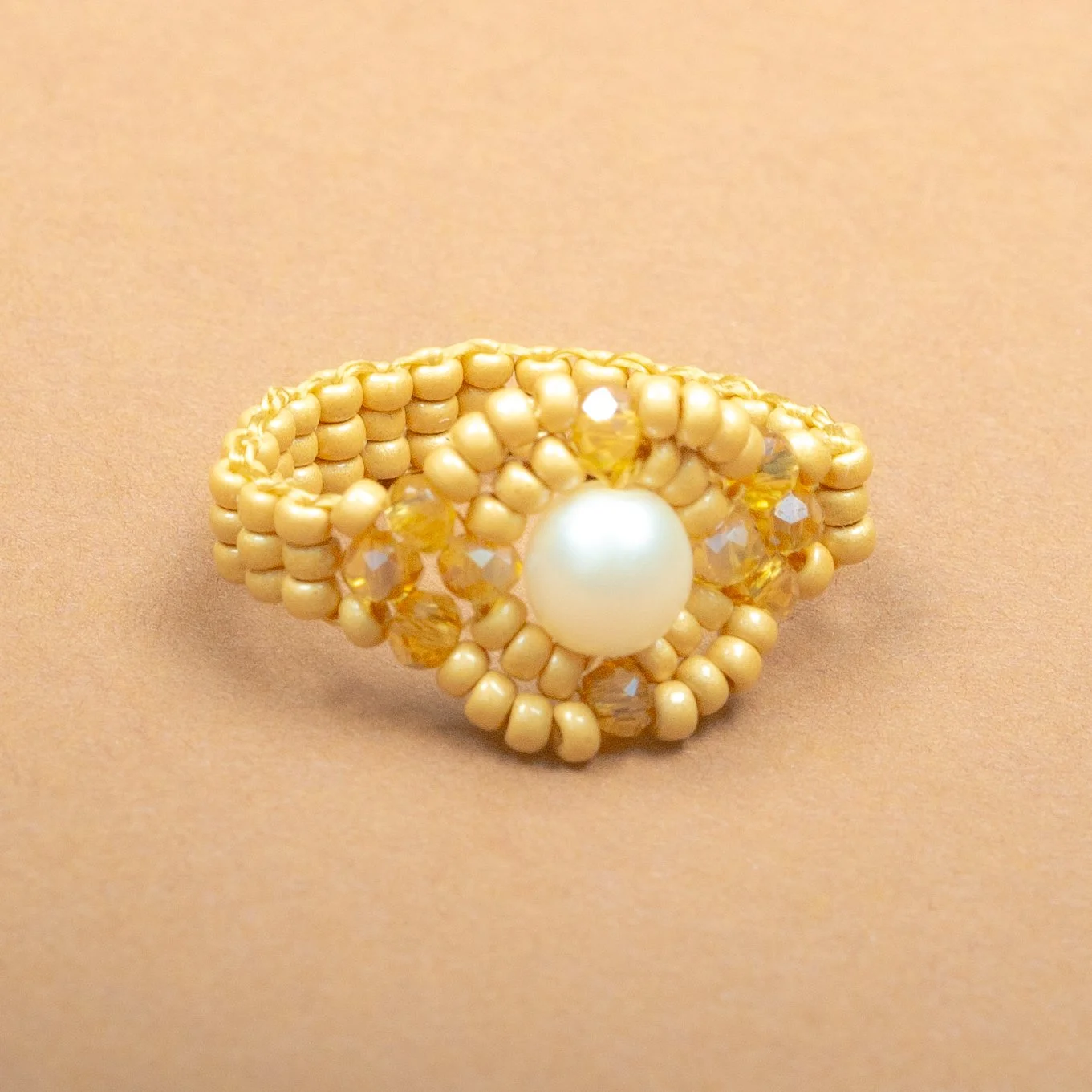Vintage Victorian vibe check, this ring is for you. The Moonlight Ring is a beaded ring, made with glass beads and natural stones. This one has a Serpentine stone.